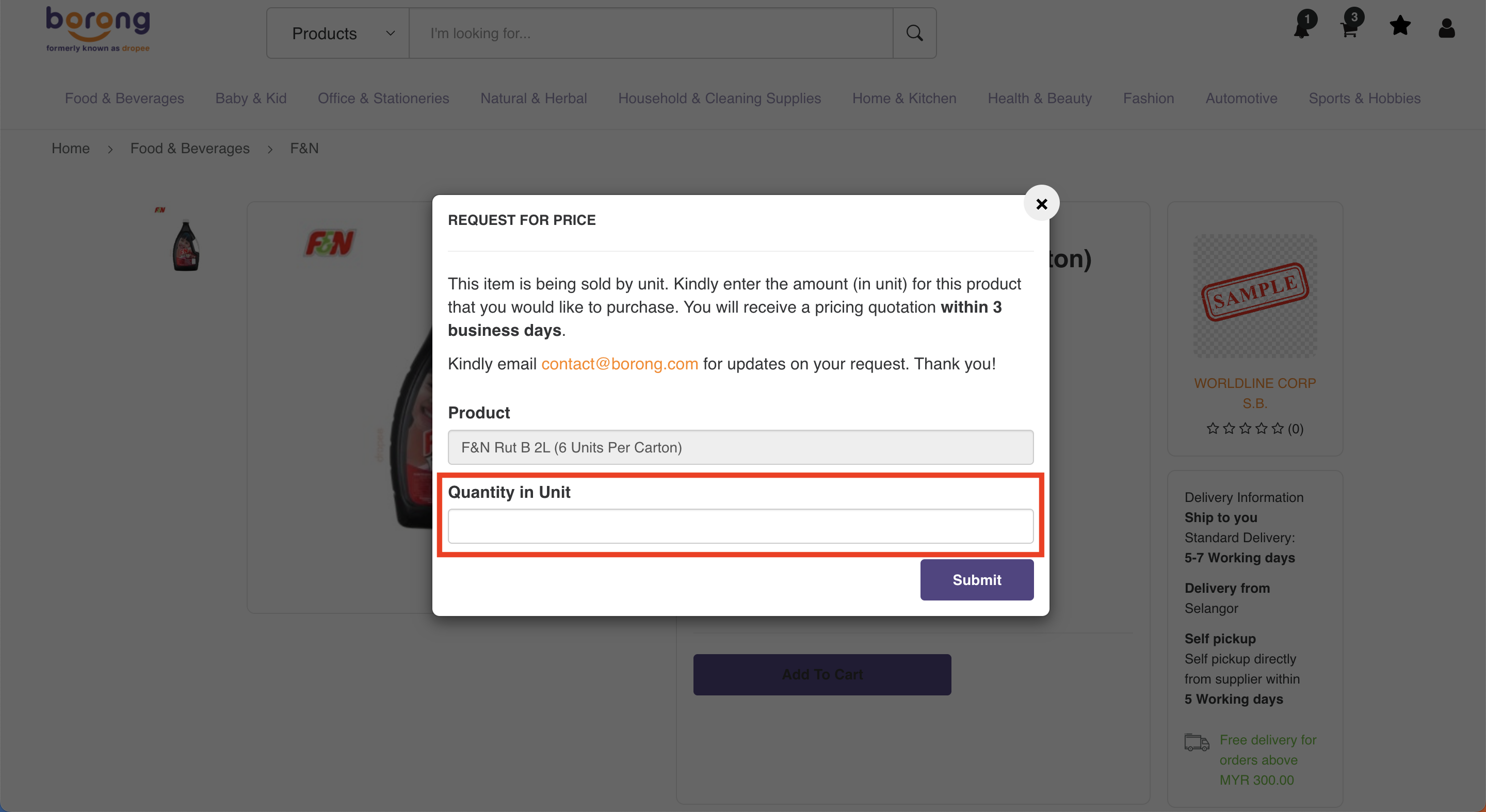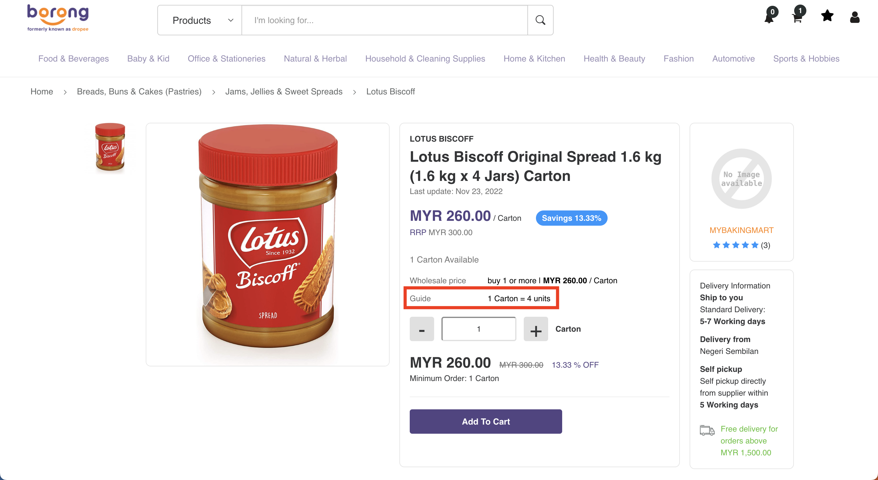 Prices are as per displayed on the website, however, buyers are able to request a quotation for purchases of more than 100 cartons of the same item via email at contact@borong.com.