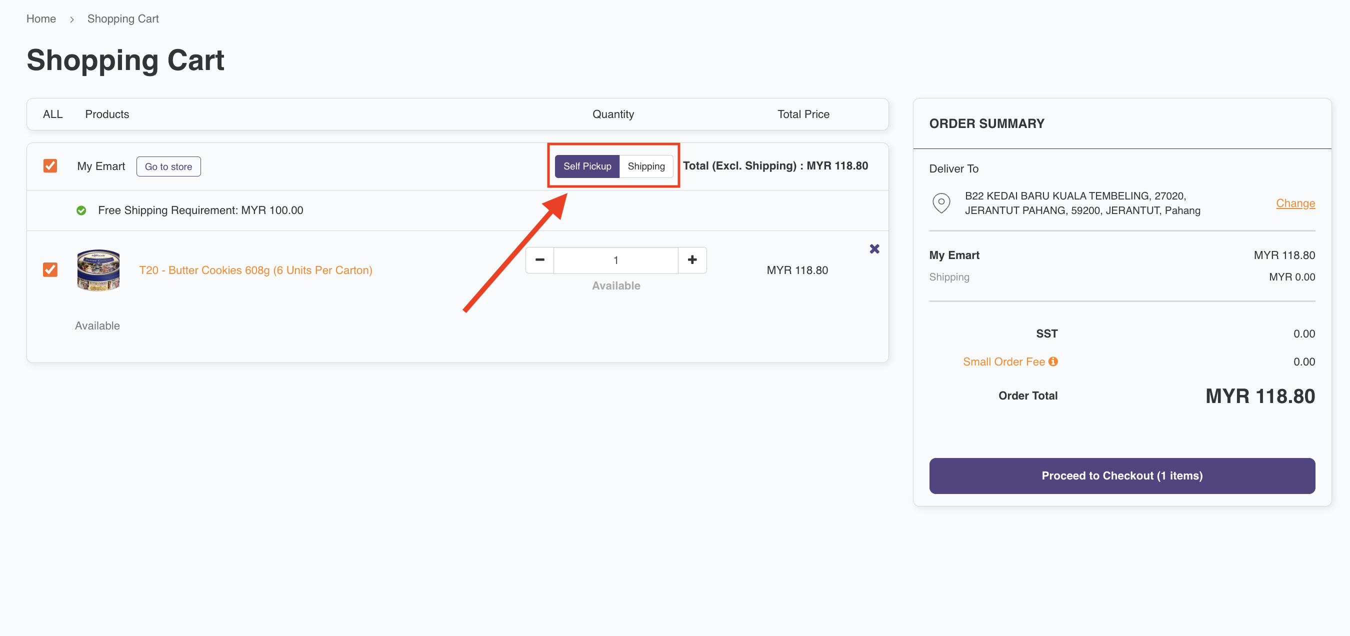 To apply for self-pickup, click and change the button from Shipping to Self Pickup at the checkout page.