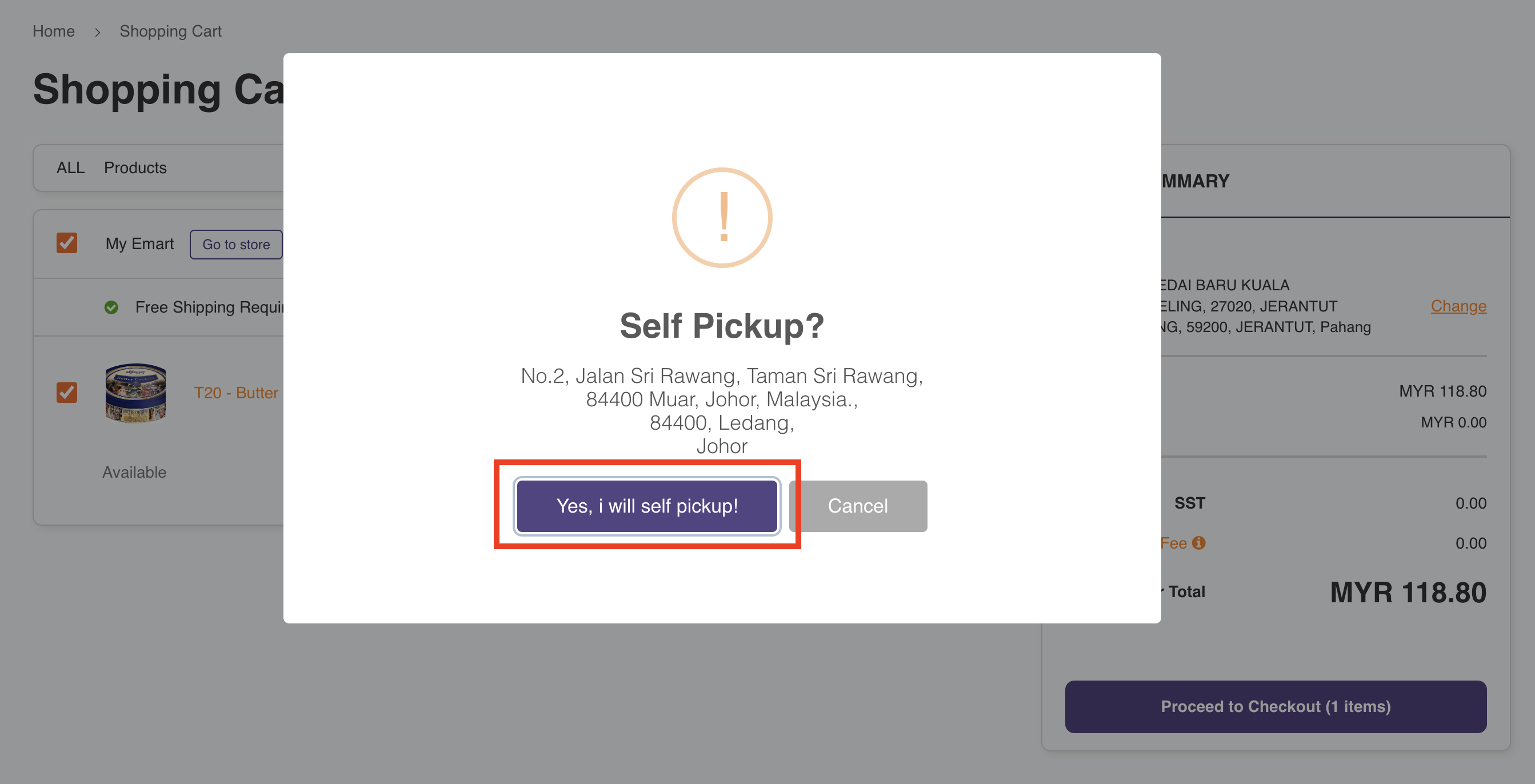 After, confirm your self-pickup by clicking the 'Yes, I will self-pickup' button in the pop-up box and you're good to go!