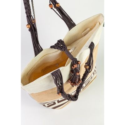 A stylish and convenient Fashion Jute bag. Swastik Print. Natural combination with inside Zip Pkt. & Top Zip. Fabric - 15x14 weave Jute with LDPE Lamination. Inside cotton lining. Dyed macron handles. Size: 41 x 43 x 15 cm. Weight: 500 gm.